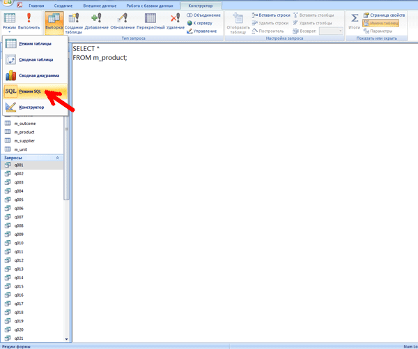 Для того чтобы перейти в режим редактирования запроса SQL, на верхней панели выберите режим SQL: