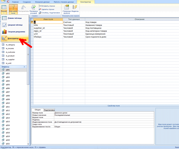 Для перехода в режим редактирования полей таблицы, на верхней панели выберите режим Конструктора: