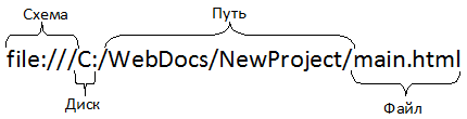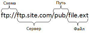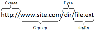 При использовании схем http, https, ftp после имени протокола пишутся двоеточие ":", два знача слеш "//", имя сервера, слеш "/", имена каталогов, разделенные знаком слеш "/" и имя файла. При использовании схемы mailto после имени схемы пишется двоеточие ":" и адрес электронной почты.